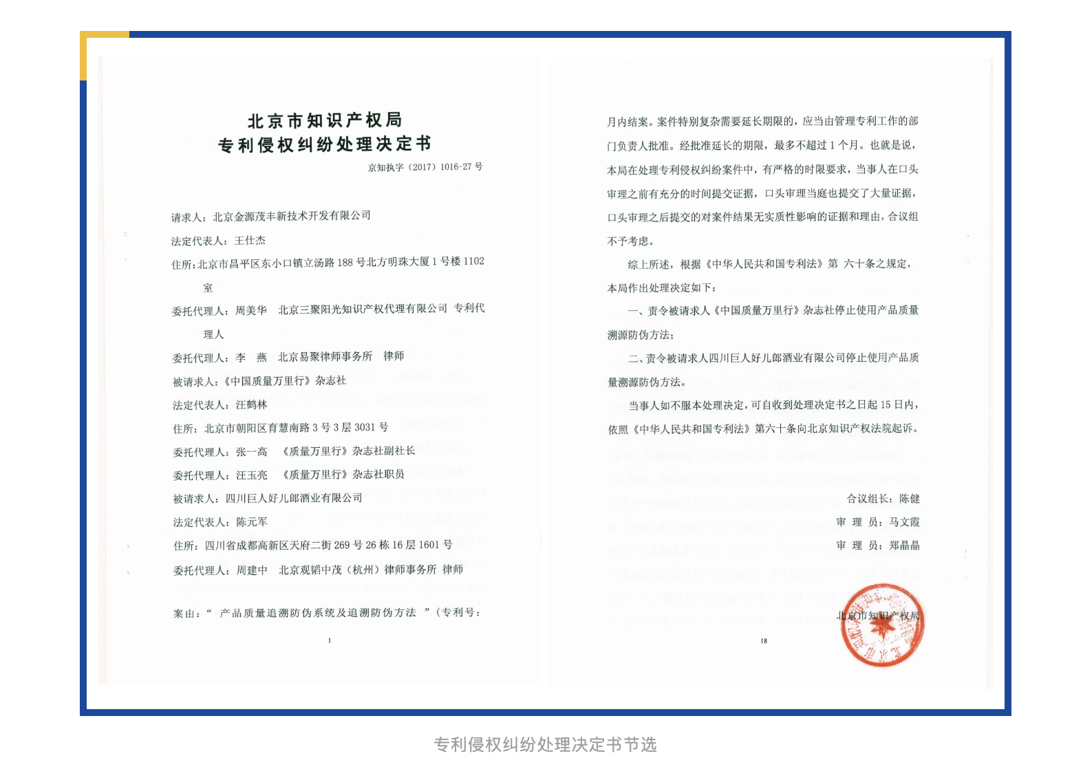 北京市知識產(chǎn)權(quán)局最終認(rèn)定某雜志社在網(wǎng)站上提供防偽溯源技術(shù)、某酒業(yè)公司在其產(chǎn)品包裝上使用防偽溯源方法構(gòu)成專利侵權(quán),責(zé)令二者立即停止專利侵權(quán)行為。