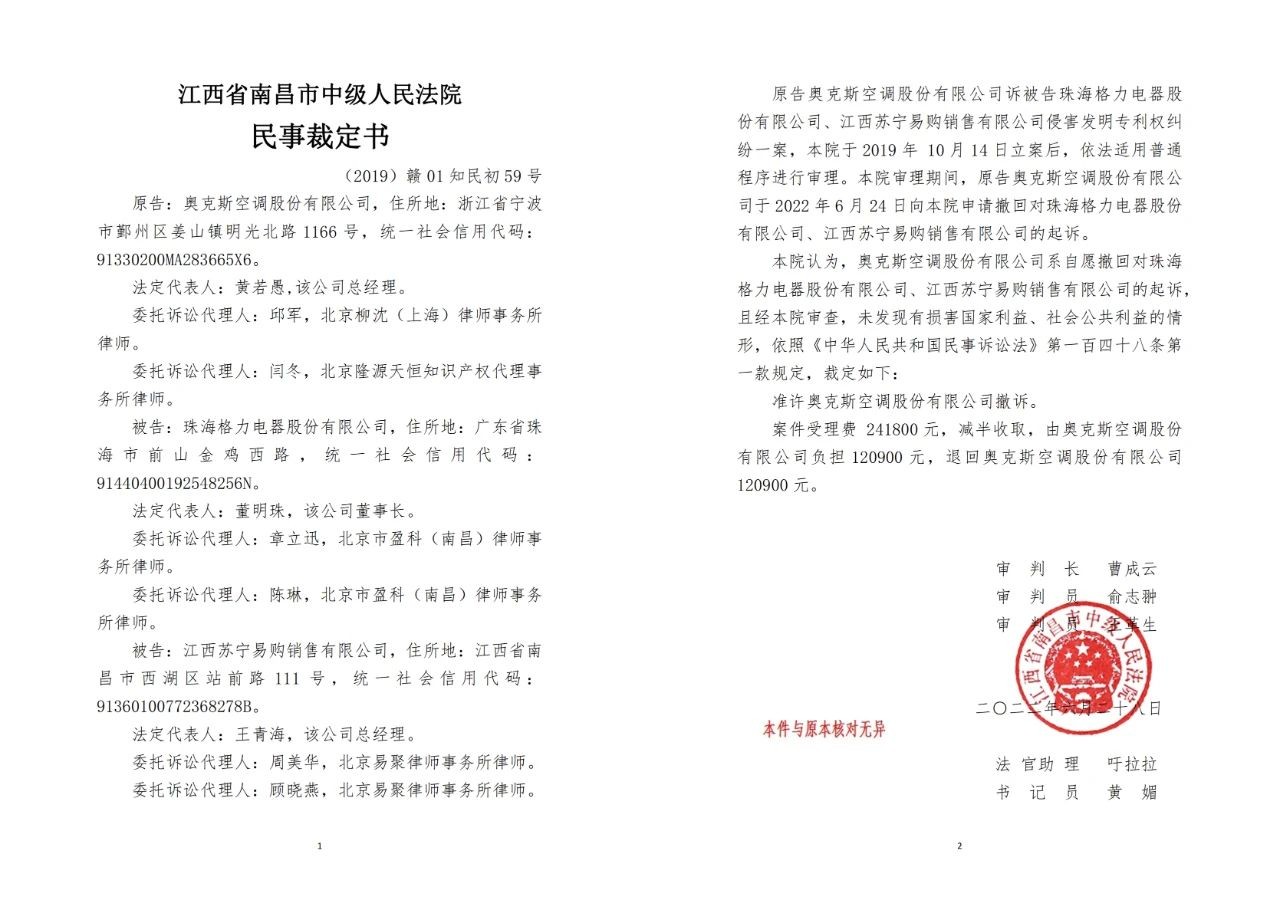 據(jù)兩件民事裁定書顯示,原告奧克斯空調(diào)股份有限公司訴被告珠海格力電器股份有限公司、江西蘇寧易購銷售有限公司侵害發(fā)明專利權(quán)糾紛一案,江西省南昌市中級人民法院于 2019 年 10 月 14 日立案后,依法適用普通程序進行審理。審理期間,原告奧克斯空調(diào)股份有限公司于 2022 年 6 月 24 日向江西省南昌市中級人民法院申請撤回對珠海格力電器股份有限公司、江西蘇寧易購銷售有限公司的起訴。