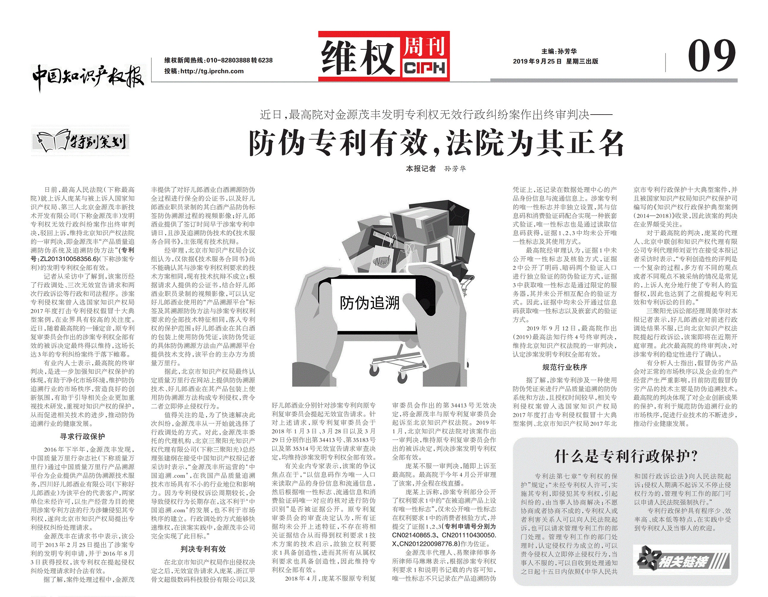 三聚陽光訴訟部經(jīng)理周美華接受知識產(chǎn)權(quán)報記者采訪時表示,好兒郎酒業(yè)對前述行政調(diào)處結(jié)果不服,已向北京知識產(chǎn)權(quán)法院提起行政訴訟,該案即將在近期開庭審理。此次最高院的終審判決,對涉案專利的穩(wěn)定性進(jìn)行了確認(rèn)。假冒偽劣產(chǎn)品會對正常的市場秩序以及企業(yè)的生產(chǎn)經(jīng)營產(chǎn)生嚴(yán)重影響,目前防范假冒偽劣產(chǎn)品的技術(shù)主要是防偽追溯技術(shù)。最高法的判決體現(xiàn)了對企業(yè)創(chuàng)新成果的保護(hù),有利于規(guī)范防偽追溯行業(yè)的市場秩序,促進(jìn)行業(yè)技術(shù)的不斷進(jìn)步,推動行業(yè)健康發(fā)展。
