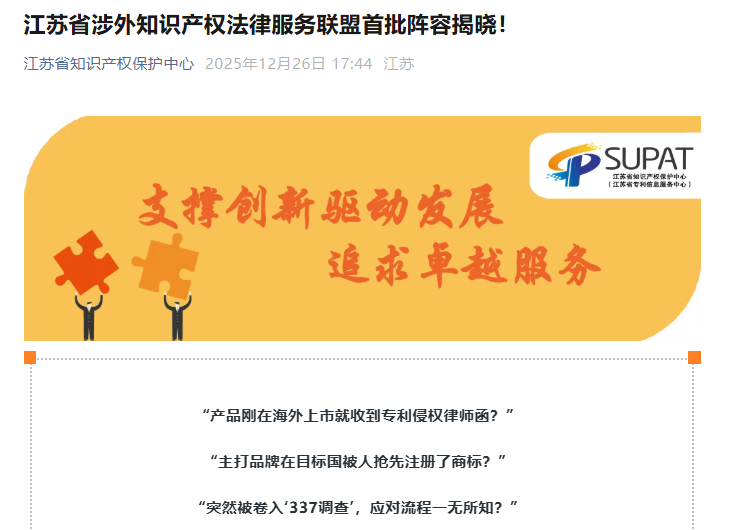 近日,三聚陽光正式加入江蘇省涉外知識產(chǎn)權(quán)法律服務聯(lián)盟。該聯(lián)盟面向江蘇企業(yè)“走出去”過程中的商標搶注、專利糾紛與“337調(diào)查”等高頻風險,旨在整合涉外知識產(chǎn)權(quán)法律服務資源,提升企業(yè)海外合規(guī)與爭端應對能力,推動形成更具韌性的出海知識產(chǎn)權(quán)保障體系。