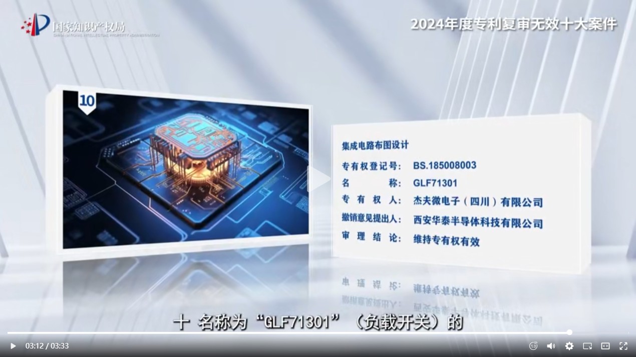4月26日,國家知識產(chǎn)權(quán)局公布“2024年度專利復(fù)審無效十大案件”,由三聚陽光代理、涉及杰夫微電子(四川)有限公司的“名稱為‘GLF71301’(負(fù)載開關(guān))的集成電路布圖設(shè)計專有權(quán)撤銷案”成功入選。此案不僅維持了杰夫微電子的布圖設(shè)計專有權(quán)有效,更重要的是,它作為自2001年《集成電路布圖設(shè)計保護(hù)條例》(以下簡稱“《條例》”)實施以來,國家知識產(chǎn)權(quán)局作出的第11號集成電路布圖設(shè)計撤銷程序?qū)彶闆Q定書 ,判例價值尤為突出,對《條例》的具體實踐、法律條款的清晰化以及行業(yè)標(biāo)準(zhǔn)的樹立具有重大意義。