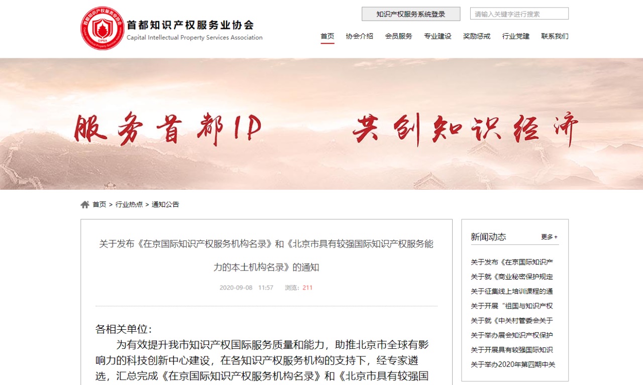 9月8日,首都知識產權服務業(yè)協會發(fā)布了最新《北京市具有較強國際知識產權服務能力的本土機構名錄》,該名錄收錄了北京市具有較強國際知識產權服務能力的50家本土服務機構,三聚陽光知識產權集團旗下北京三聚陽光知識產權代理有限公司入選。該名錄發(fā)布后,將與一同發(fā)布的《在京國際知識產權服務機構名錄》作為參考,供有國際知識產權專業(yè)服務需求的市場主體選擇。