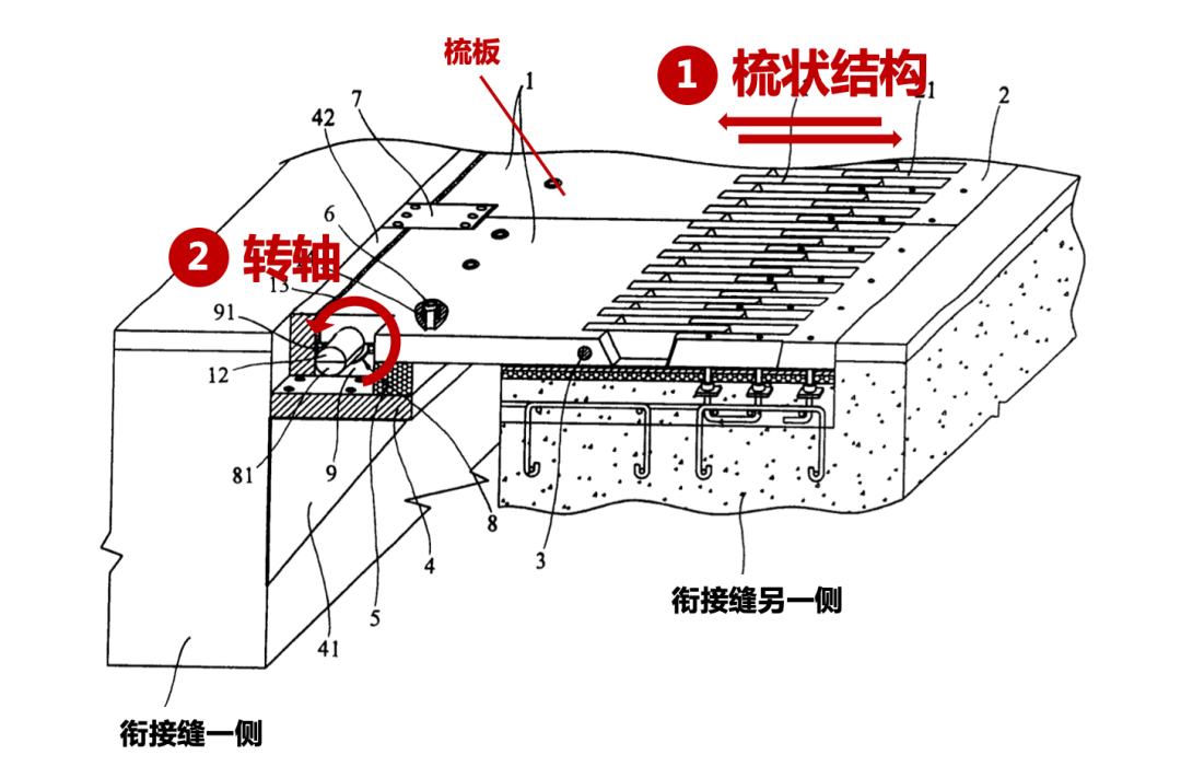 大型橋梁在橋體自重、橋面負載和溫濕鹽等因素共同影響下一定會發(fā)生變形,導致大橋的“梁”末端翹起,在車輛通過時,會造成障礙,并且也容易引發(fā)活動梳齒板的損壞。 涉案專利主要用兩個結(jié)構(gòu)解決兩個翹起的梁之間的銜接問題——可以橫向伸縮調(diào)整距離的梳狀結(jié)構(gòu)、用于調(diào)整一側(cè)梳板角度的轉(zhuǎn)軸。當伸縮縫兩側(cè)翹起時:橋面將發(fā)生角度變化時,轉(zhuǎn)軸通過調(diào)整梳板角度,能夠保證路面過渡平順;銜接縫兩側(cè)距離發(fā)生變化時,梳狀結(jié)構(gòu)通過橫向位移,保障路面平整,車輛不易發(fā)生顛簸。