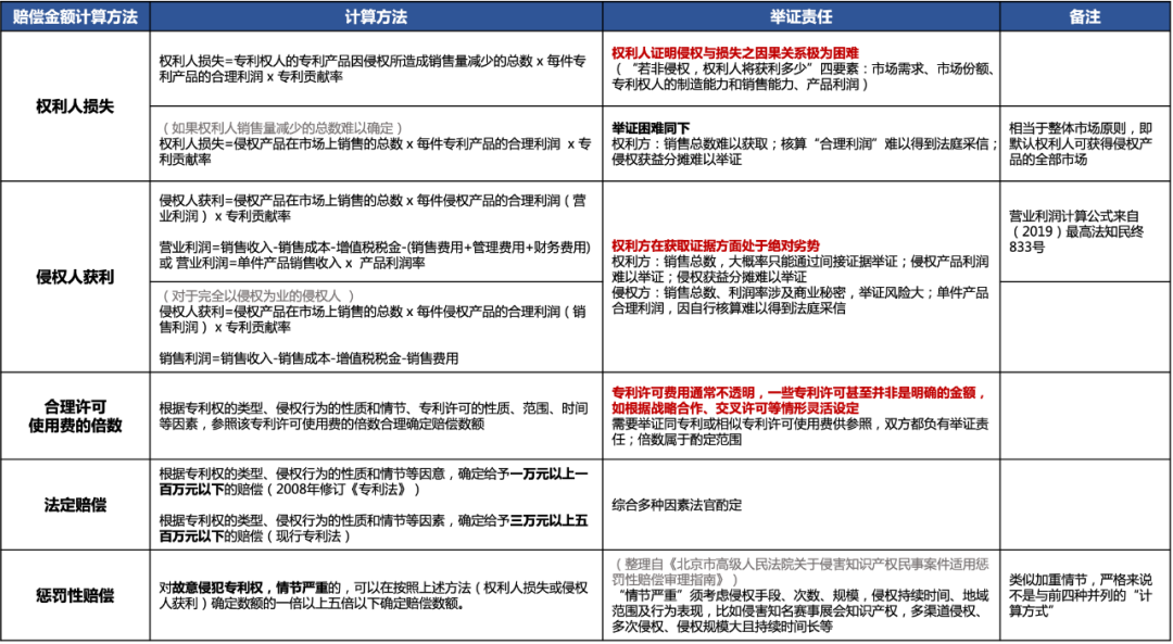 目前《專利法》提及的專利侵權(quán)賠償計算方式主要是五種,見下圖。(“懲罰性賠償”嚴格來說不算基礎(chǔ)賠償金額計算方式,而是類似加重情節(jié),只適用侵權(quán)人故意且情節(jié)嚴重的情形。)
