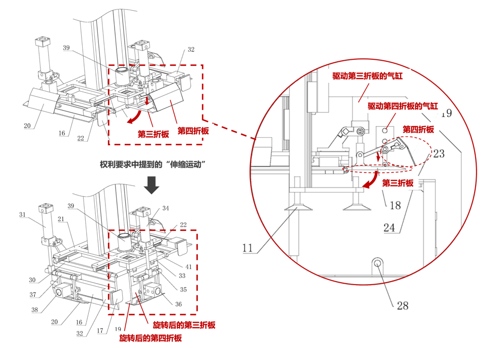 請注意動圖及結(jié)構(gòu)圖中,第四折板的運動方式是“旋轉(zhuǎn)+平移”,即專利權(quán)利要求1中提到的用語“伸縮運動”。