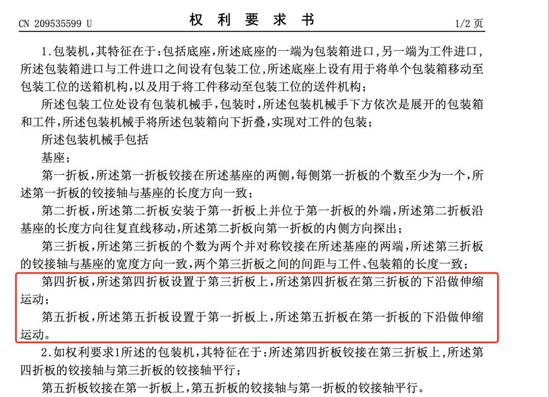 • 首先,結(jié)合專利說明書。涉案專利“包裝機”(申請?zhí)?01822124032.9)權(quán)利要求1中寫到:“第四折板,所述第四折板設(shè)置于第三折板上,所述第四折板在第三折板的下沿做伸縮運動;第五折板,所述第五折板設(shè)置于第一折板上,所述第五折板在第一折板的下沿做伸縮運動。