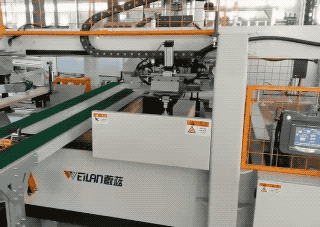 • 第三步,折板保持抓取的狀態(tài),將包好的木板垛放到傳送帶上運走。