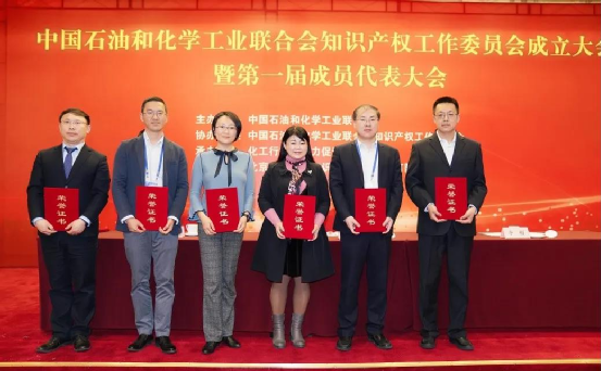 中國(guó)石油與化學(xué)工業(yè)聯(lián)合會(huì)知識(shí)產(chǎn)權(quán)工作委員會(huì)為張建綱(圖中右二)頒發(fā)證書(shū)并合影