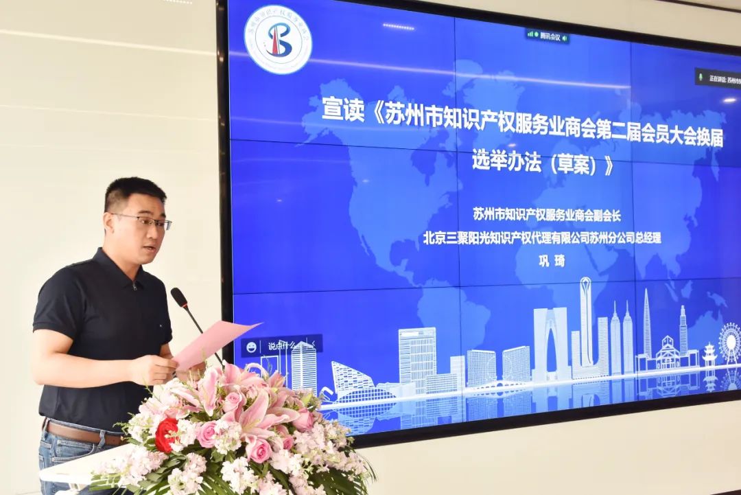 三聚陽光華東區(qū)總經(jīng)理、蘇州市知識產(chǎn)權服務業(yè)商會副會長鞏琦在會上宣讀《蘇州市知識產(chǎn)權服務業(yè)商會第二屆會員大會換屆選舉辦法(草案)》