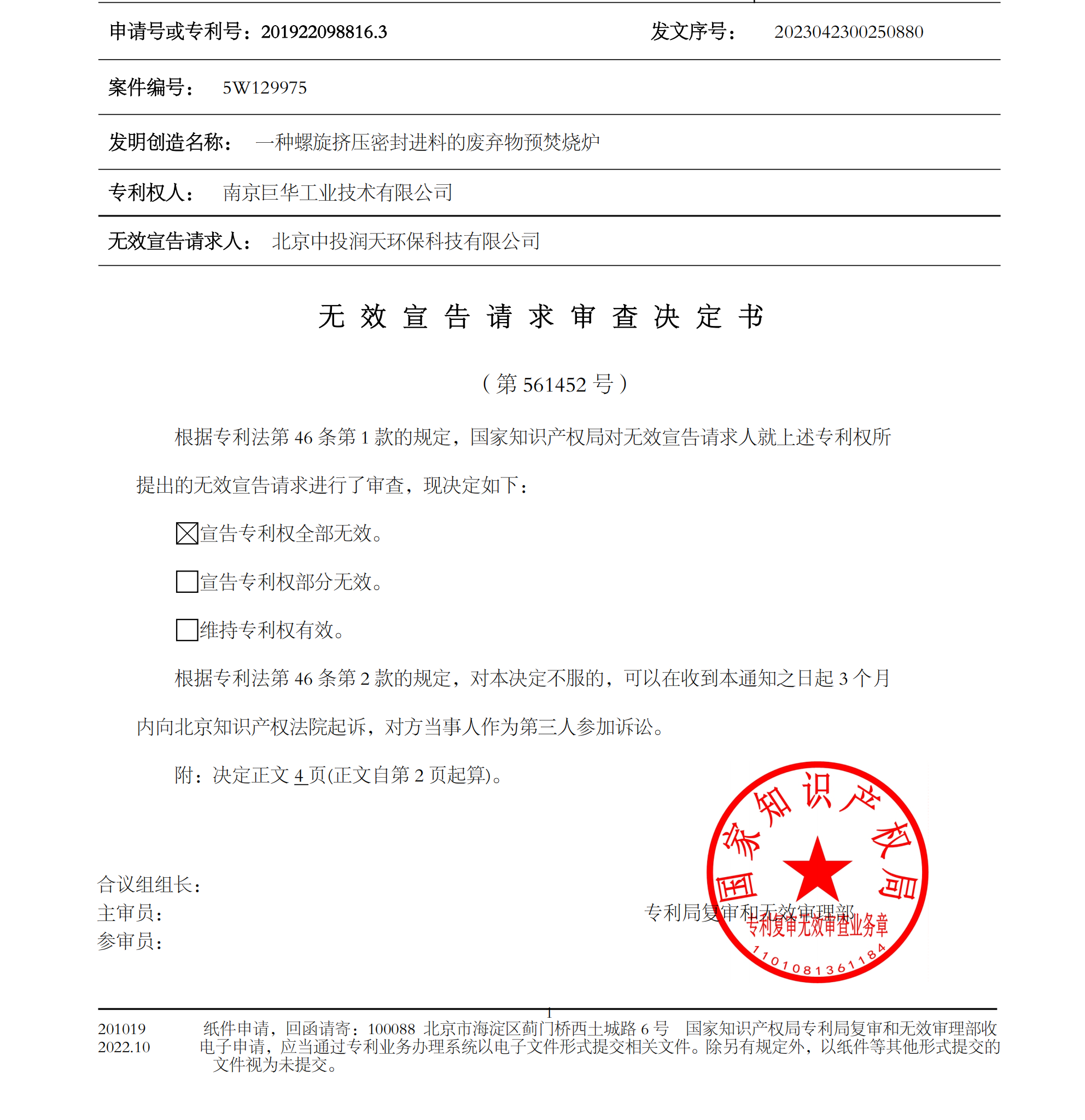 近日,由北京三聚陽光知識產(chǎn)權(quán)代理有限公司和北京易聚律師事務(wù)所聯(lián)合代理北京中投潤天環(huán)??萍加邢薰镜膶@麩o效宣告勝利結(jié)案。國家知識產(chǎn)權(quán)局作出第 561452 號無效審查決定,宣告南京巨華工業(yè)技術(shù)有限公司擁有的“一種螺旋擠壓密封進(jìn)料的廢棄物預(yù)焚燒爐”實(shí)用新型專利權(quán)全部無效。