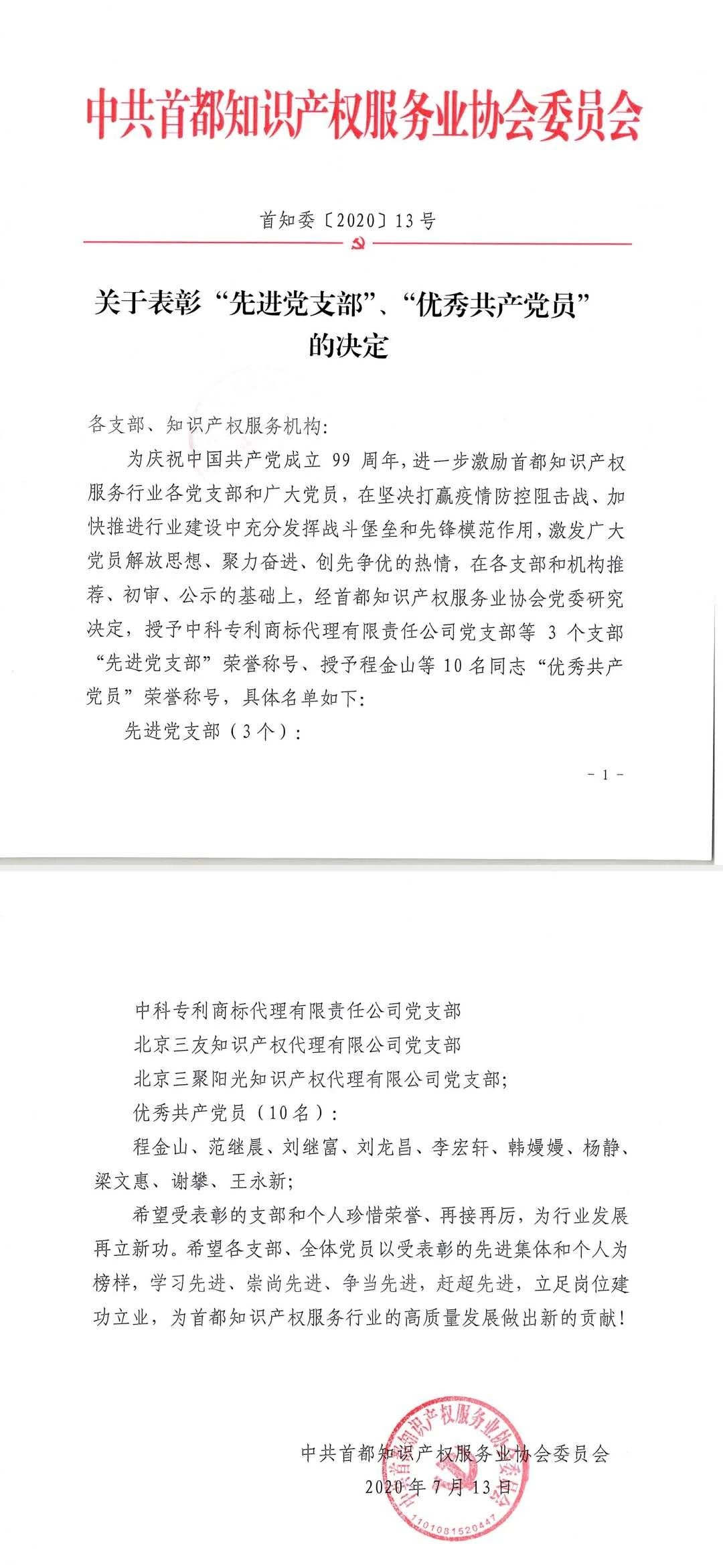近日,首都知識(shí)產(chǎn)權(quán)服務(wù)業(yè)協(xié)會(huì)黨委下發(fā)表彰決定,授予北京三聚陽(yáng)光知識(shí)產(chǎn)權(quán)代理有限公司黨支部“先進(jìn)黨支部”榮譽(yù)稱號(hào),以表彰三聚陽(yáng)光黨支部在支部成立以來(lái),在支部建設(shè)、服務(wù)客戶等方面的突出成績(jī),特別表彰疫情防控阻擊戰(zhàn)打響以來(lái),帶領(lǐng)公司員工做好疫情防控同時(shí)開(kāi)展知識(shí)產(chǎn)權(quán)服務(wù)的突出表現(xiàn)。